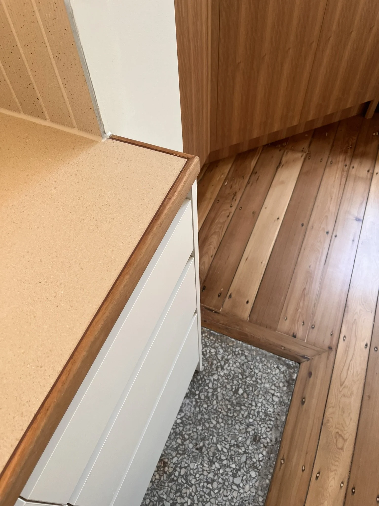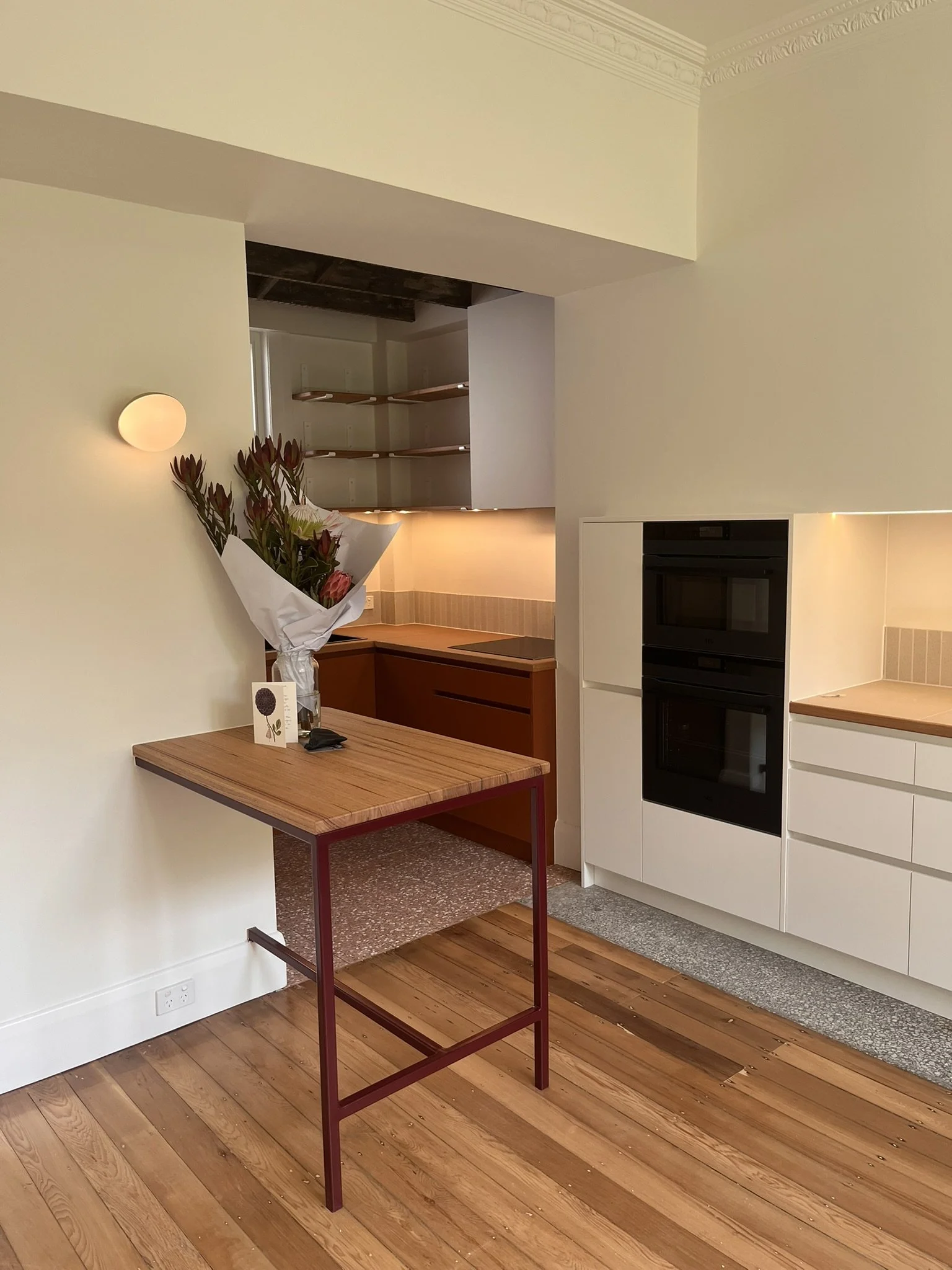 The renovation of the interior provided an opportunity to restore original elements such as the timber flooring, hidden for years under slate tiles, and reveal elements of the past such as the terrazzo hearth and timber herringbone bracing.
